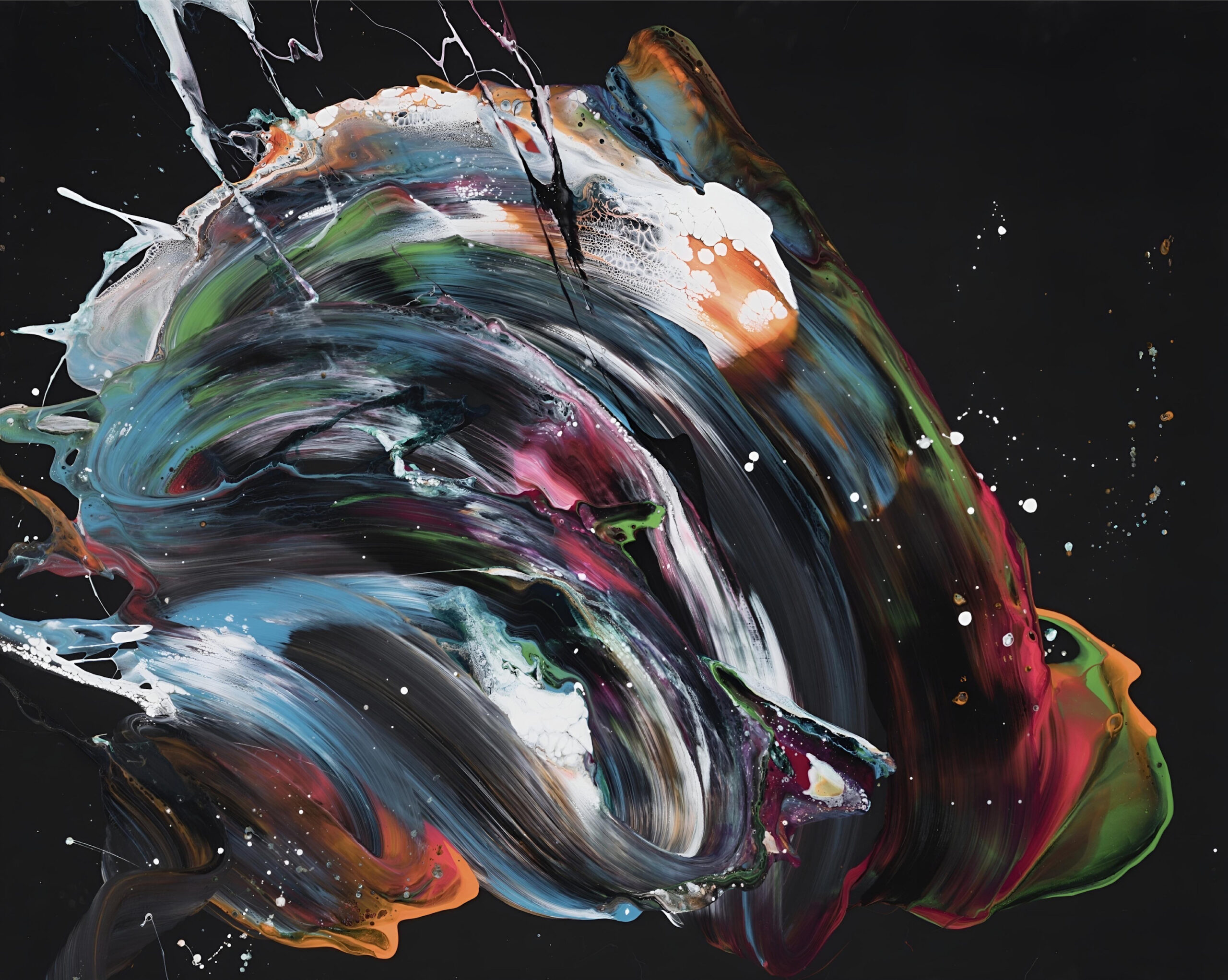 A sweeping crescent of deep turquoise, rich magenta, and burnt orange slices across matte black, capturing the feeling of something powerful just starting to form. Soft veils of white and emerald green keep the motion fluid and open-ended. Bring the bold energy of Nicole Ackerman’s ‘Beginning 1’ into your home with this museum-quality art print.