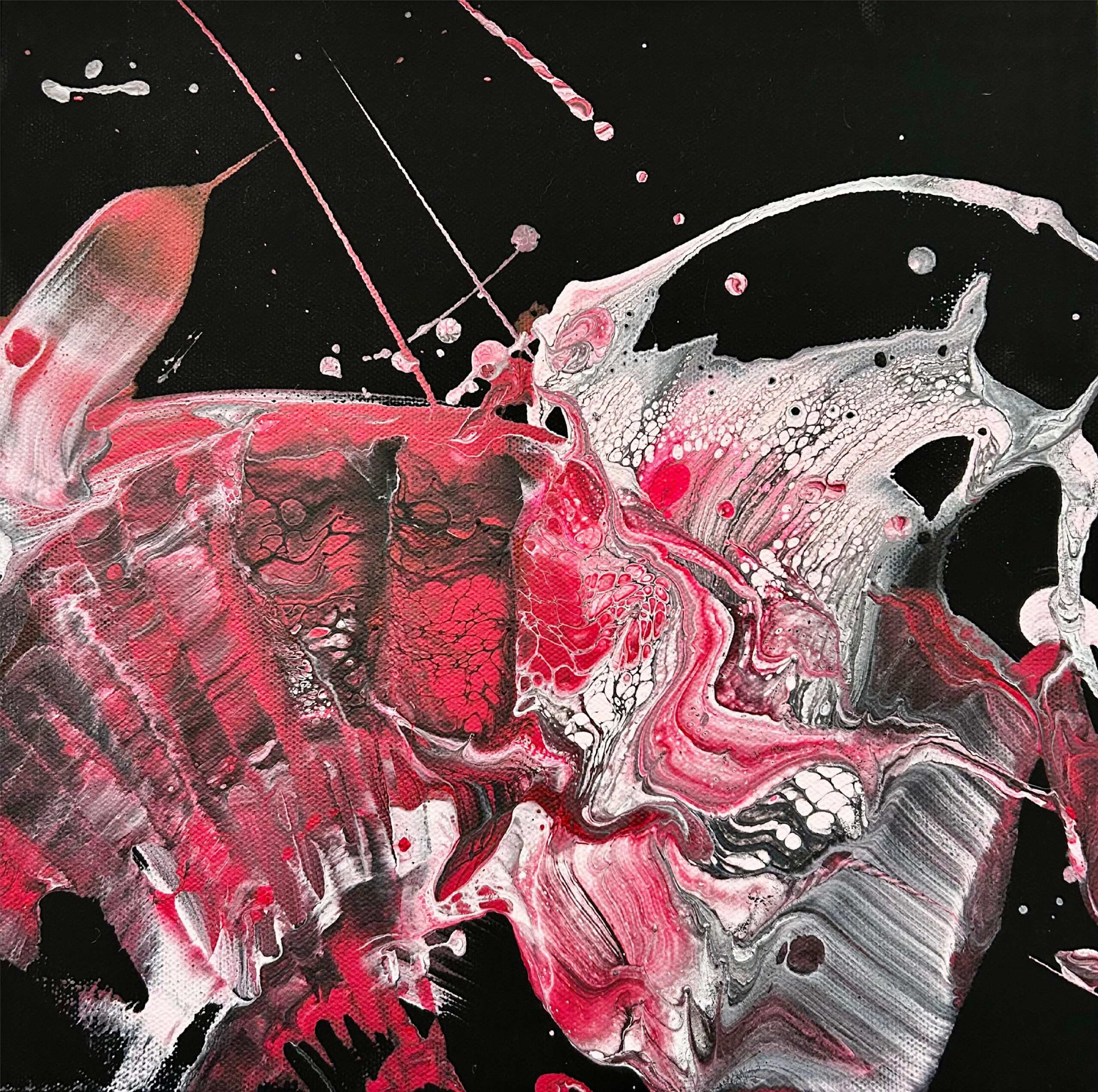 Crimson and bubblegum pink push forward from deep black, forming layered, petal-like shapes that seem to hover above the surface. This piece, ‘Black Velvet Rose 8’ by Nicole Ackerman, was created with vivid fluid acrylics on an ultra-black canvas. The original’s texture and glazing add depth and visual richness.