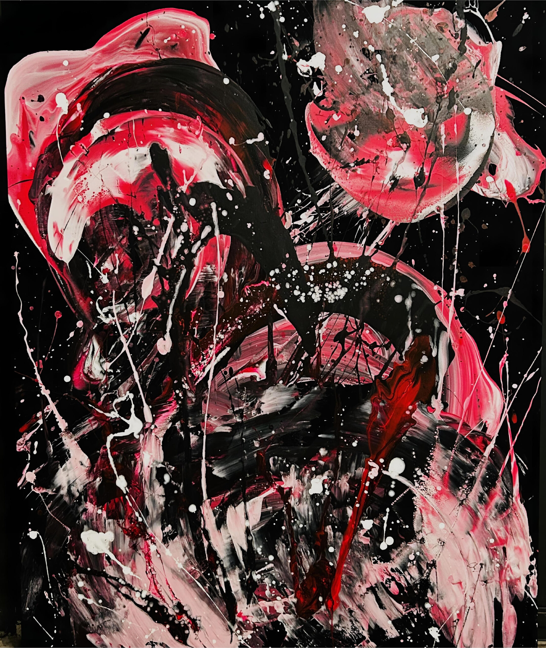 Deep crimson, jet black, and milky white collide in bold arcs and splashes, giving this piece a playful yet powerful energy. High-contrast shapes feel like color bubbles bursting in motion.