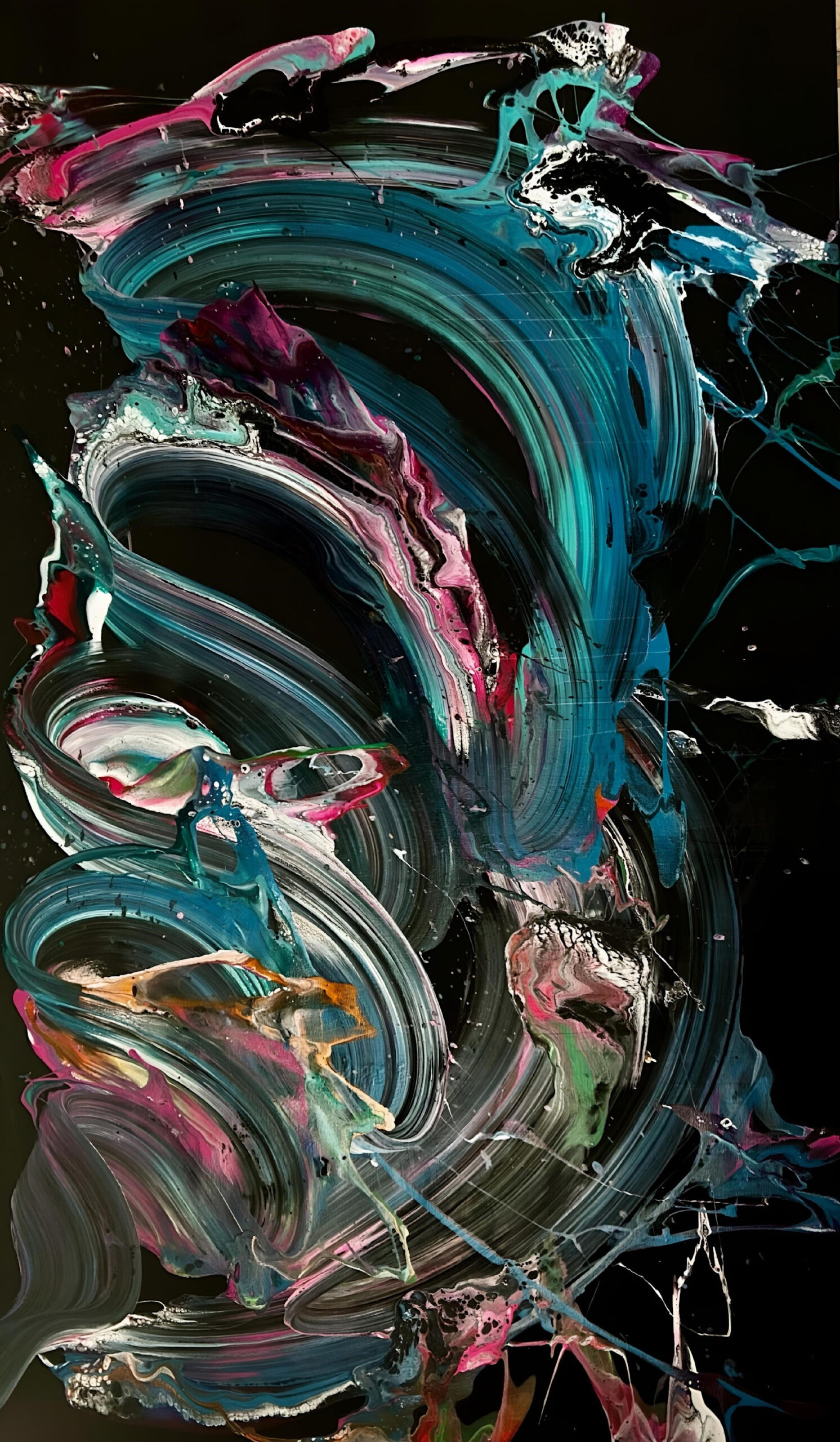 On this artwork, vivid fluid acrylics create a composition where deep teal and turquoise collide with hot magenta and coral orange, vibrating against pure white and pitch black.