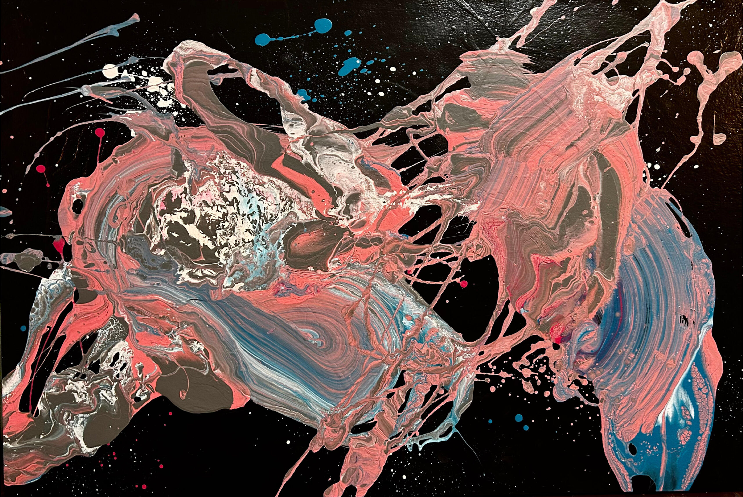 Coral pink, steel gray, icy blue, and jet black swirl together like planetary masses on the canvas, with bright cerulean and hot magenta threading through the chaos. Created with vivid fluid acrylics, the marbled textures are rich and tactile. The original work invites you to explore the physical depth, texture, and glossy ridges that a print simply cannot replicate.