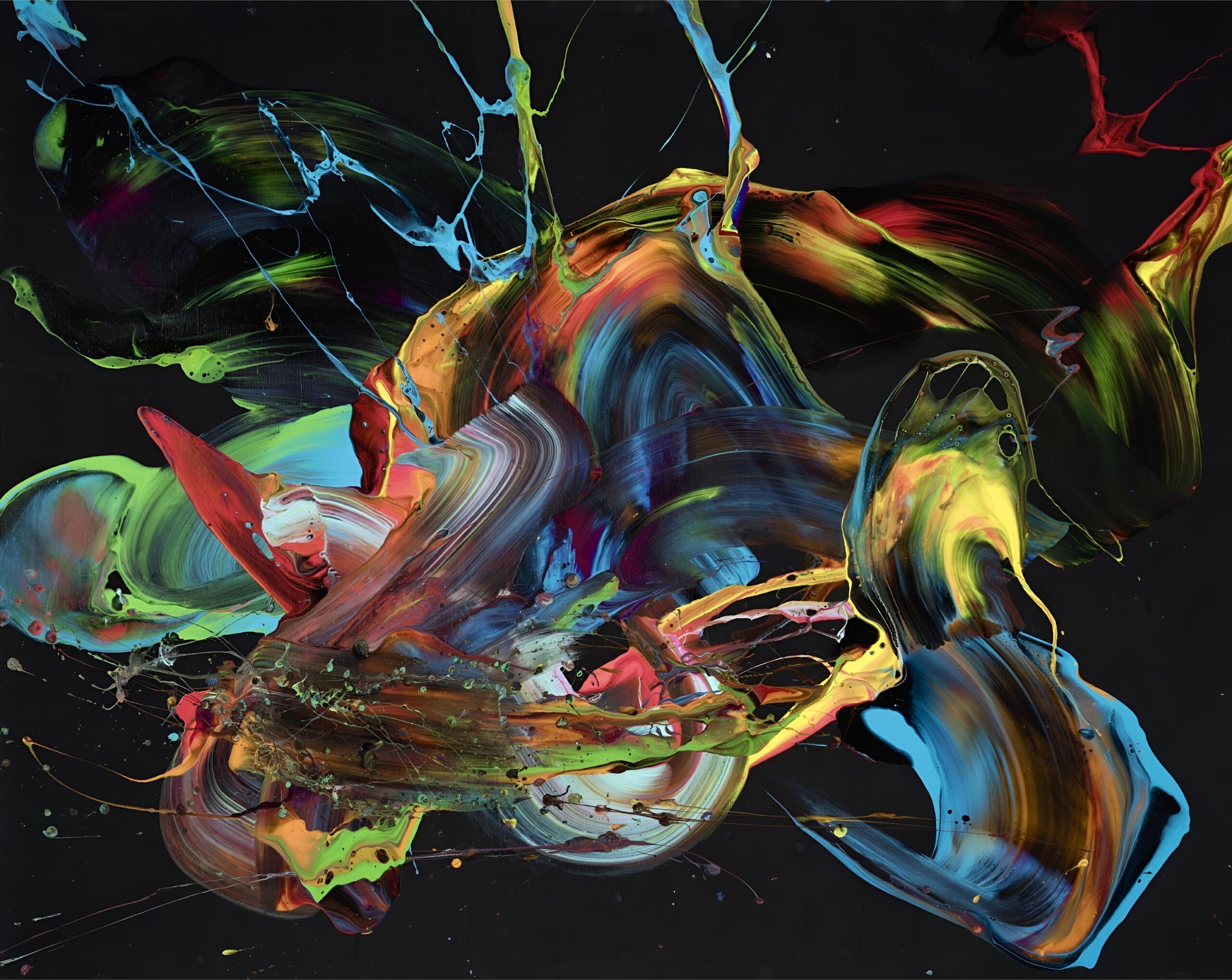 This contemporary abstract art by Nicole Ackerman was created with vivid fluid acrylics on an ultra-black canvas, inviting you to explore the physical depth, texture, and glossy ridges captured perfectly in this print. Dominant tones of electric blue, vivid lime green, and fiery orange clash and swirl in a unique display of emotion and technique.