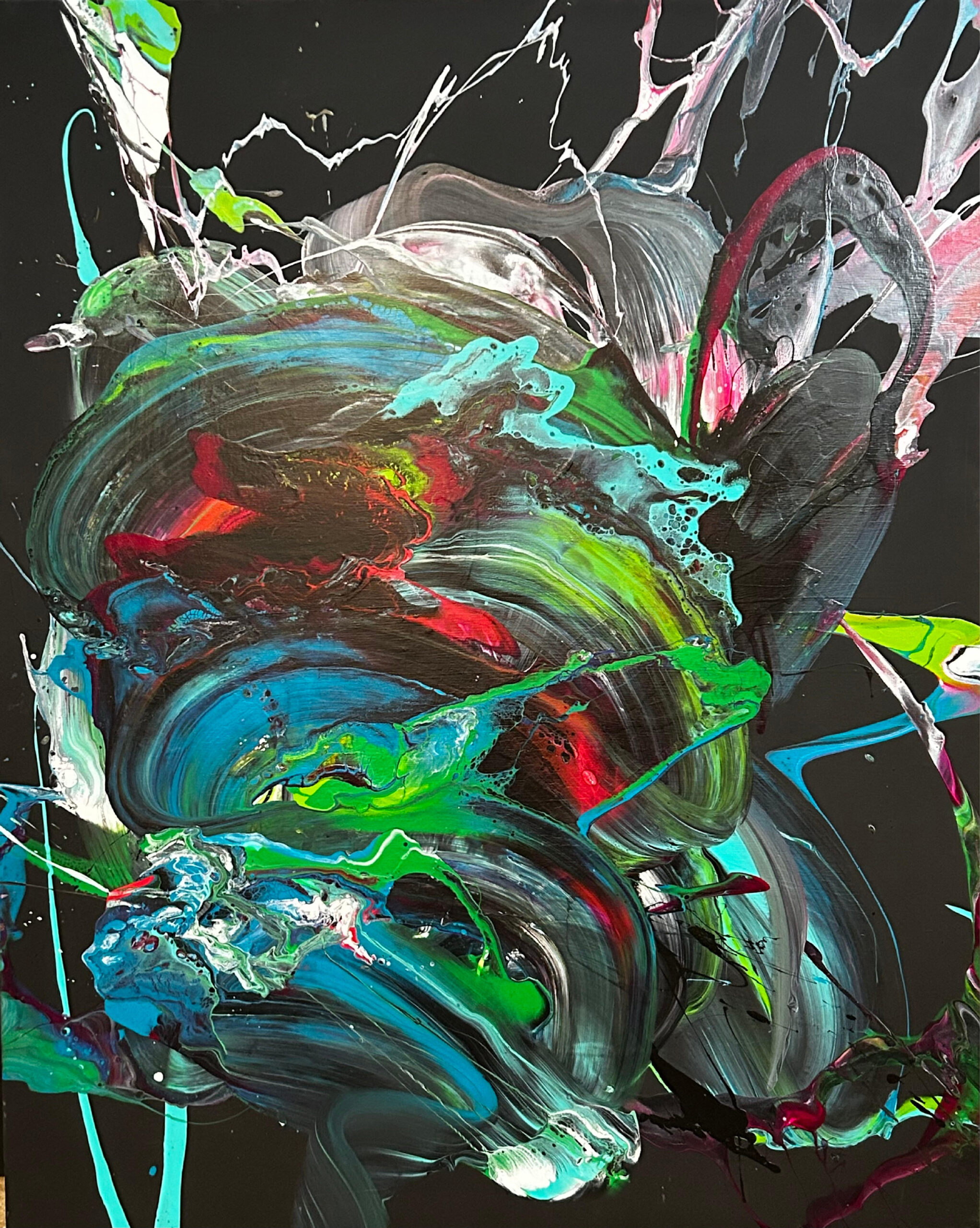 Vivid turquoise and deep cerulean blue emerge from obsidian black on the surface, suggesting ideas taking shape in the dark. This piece, created with vivid fluid acrylics on an ultra-black canvas, features dominant tones that clash and swirl in a unique display of emotion and technique.